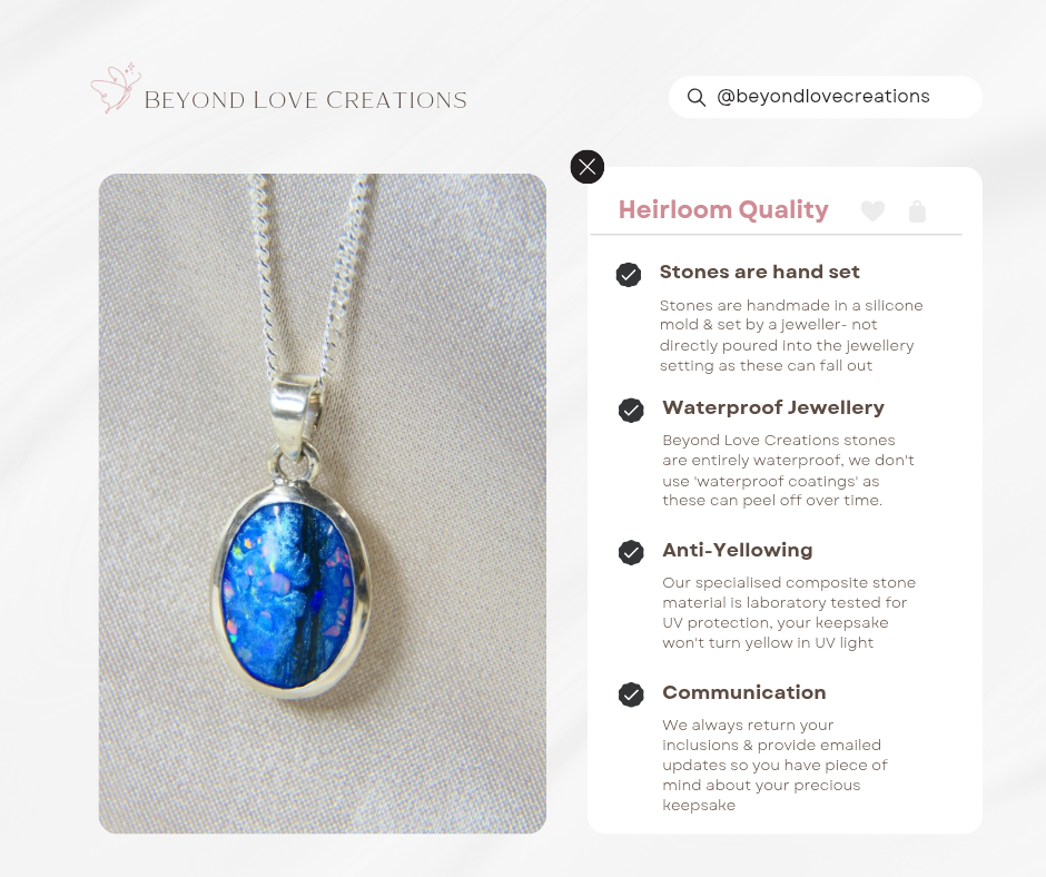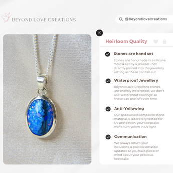 - Every Keepsake made through Beyond Love Creations comes with a care instructions card, a impregnated polishing cloth to keep your jewellery looking brand new
